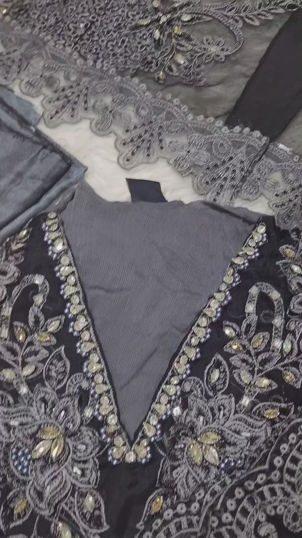Maria.B Liyana Luxury chiffon Embroidered & Embellished | Unstitched Two toned Diamond Black Grey (Eid 26')